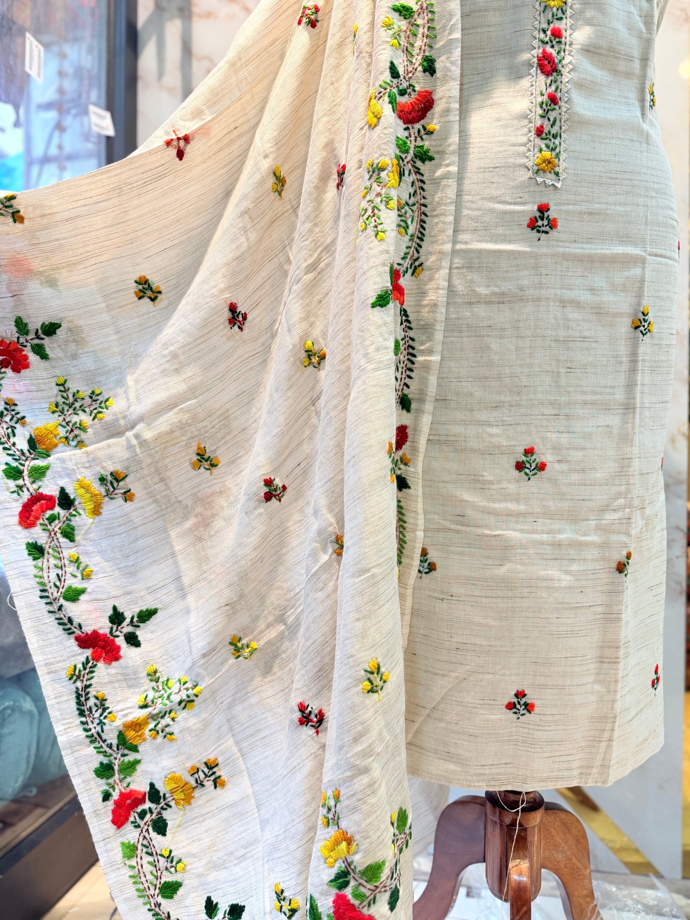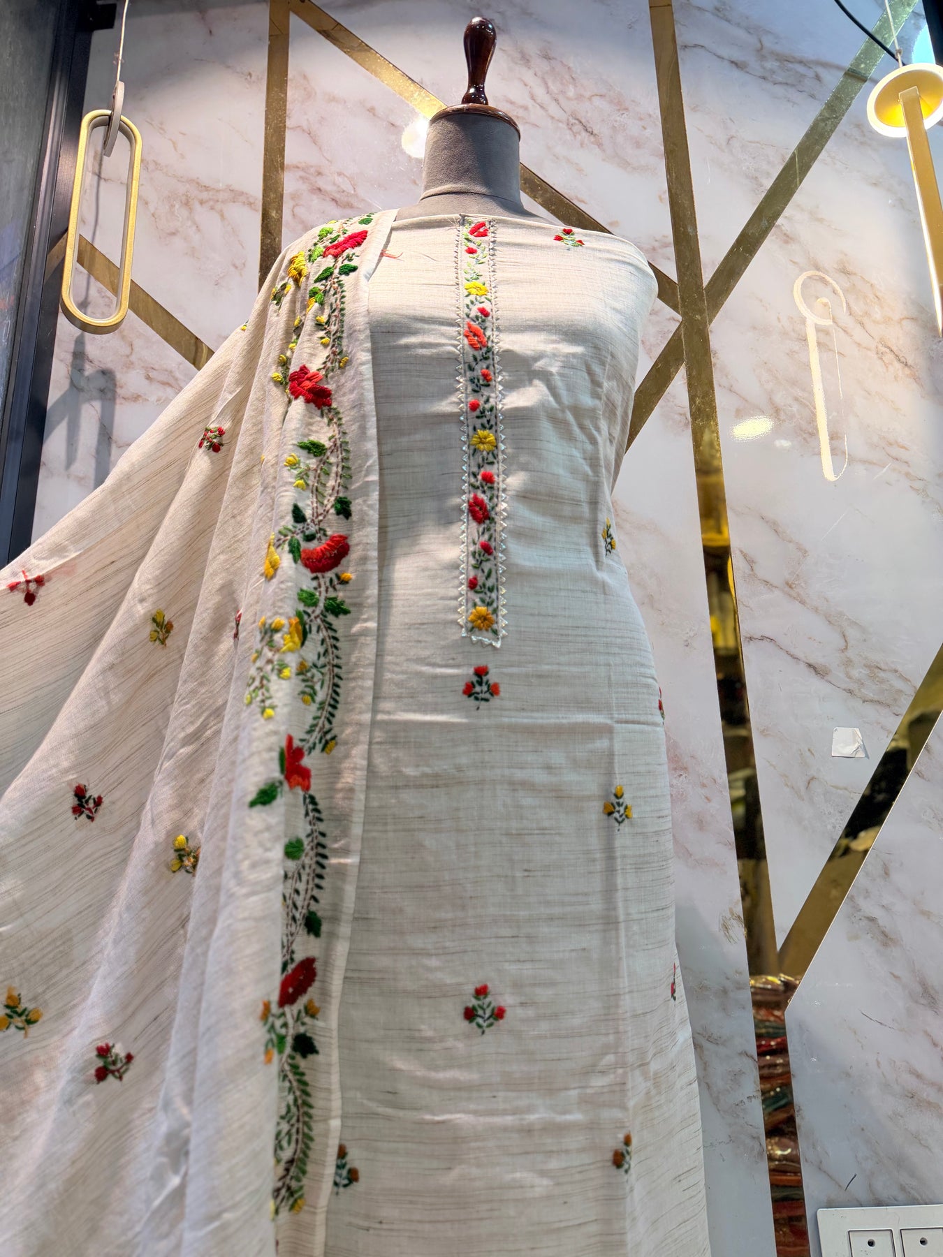 Experience elegance with this premium kantha work modal silk suit, crafted for those who appreciate fine artistry and comfort. The delicate kantha embroidery enhances the luxurious lelen cotton fabric, offering a lightweight and breathable feel ideal for sophisticated occasions. This suit combines traditional craftsmanship with modern fabric technology, ensuring durability and a graceful drape that flatters every silhouette. Perfect for formal events or festive gatherings, it delivers timeless style with expert detailing.