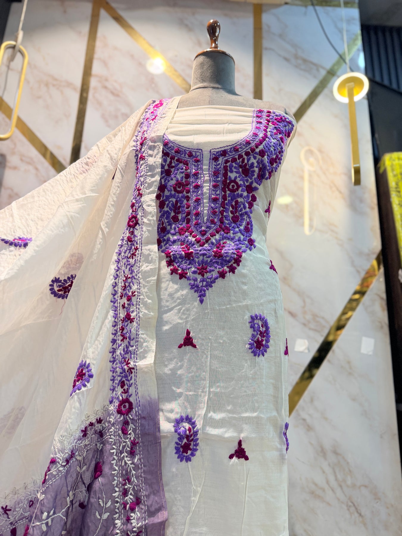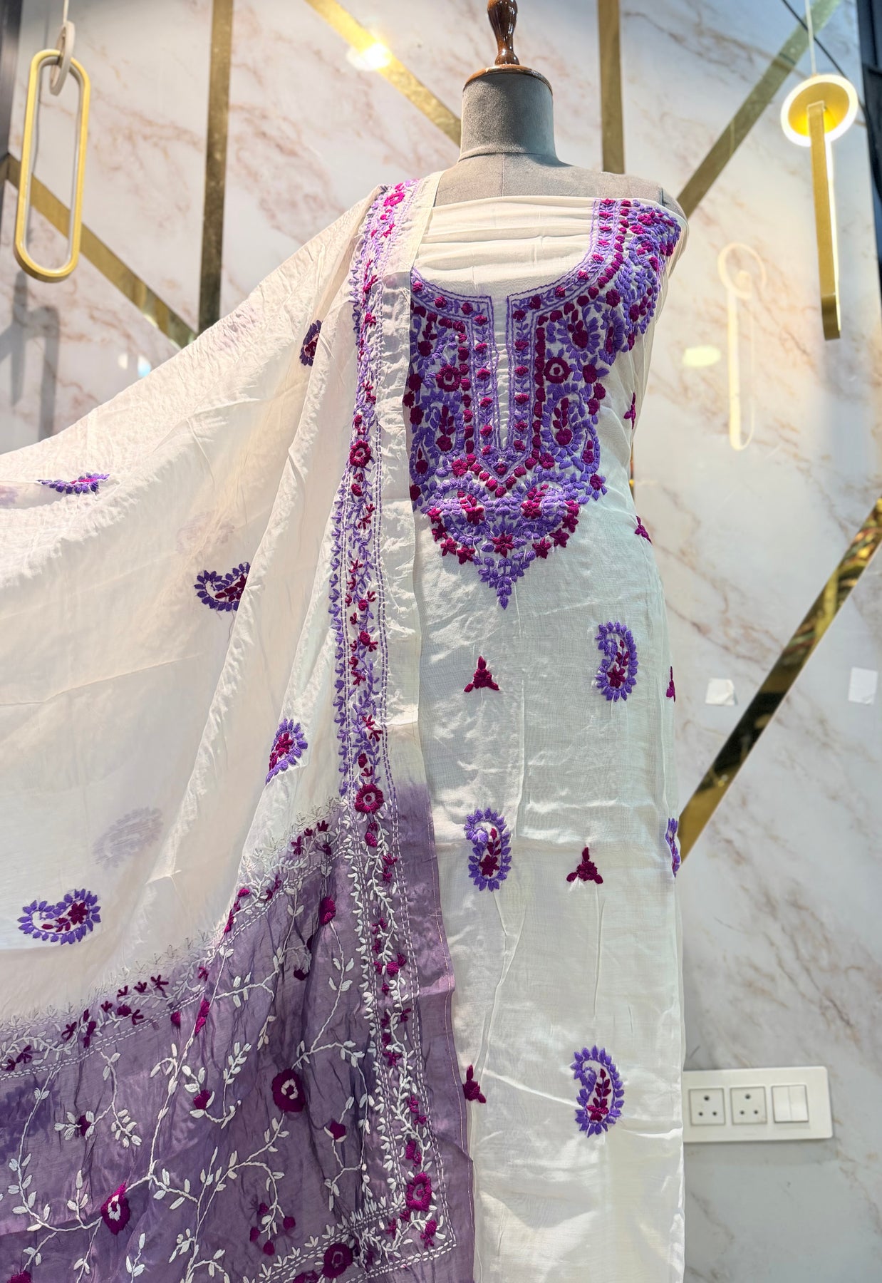 Experience elegance with this premium kantha work modal silk suit, crafted for those who appreciate fine artistry and comfort. The delicate kantha embroidery enhances the luxurious modal silk fabric, offering a lightweight and breathable feel ideal for sophisticated occasions. This suit combines traditional craftsmanship with modern fabric technology, ensuring durability and a graceful drape that flatters every silhouette. Perfect for formal events or festive gatherings, it delivers timeless style with expert detailing.