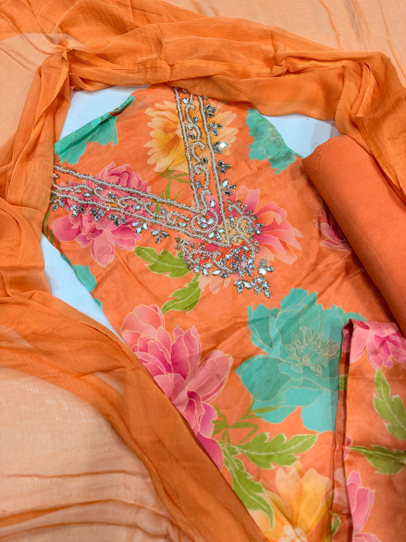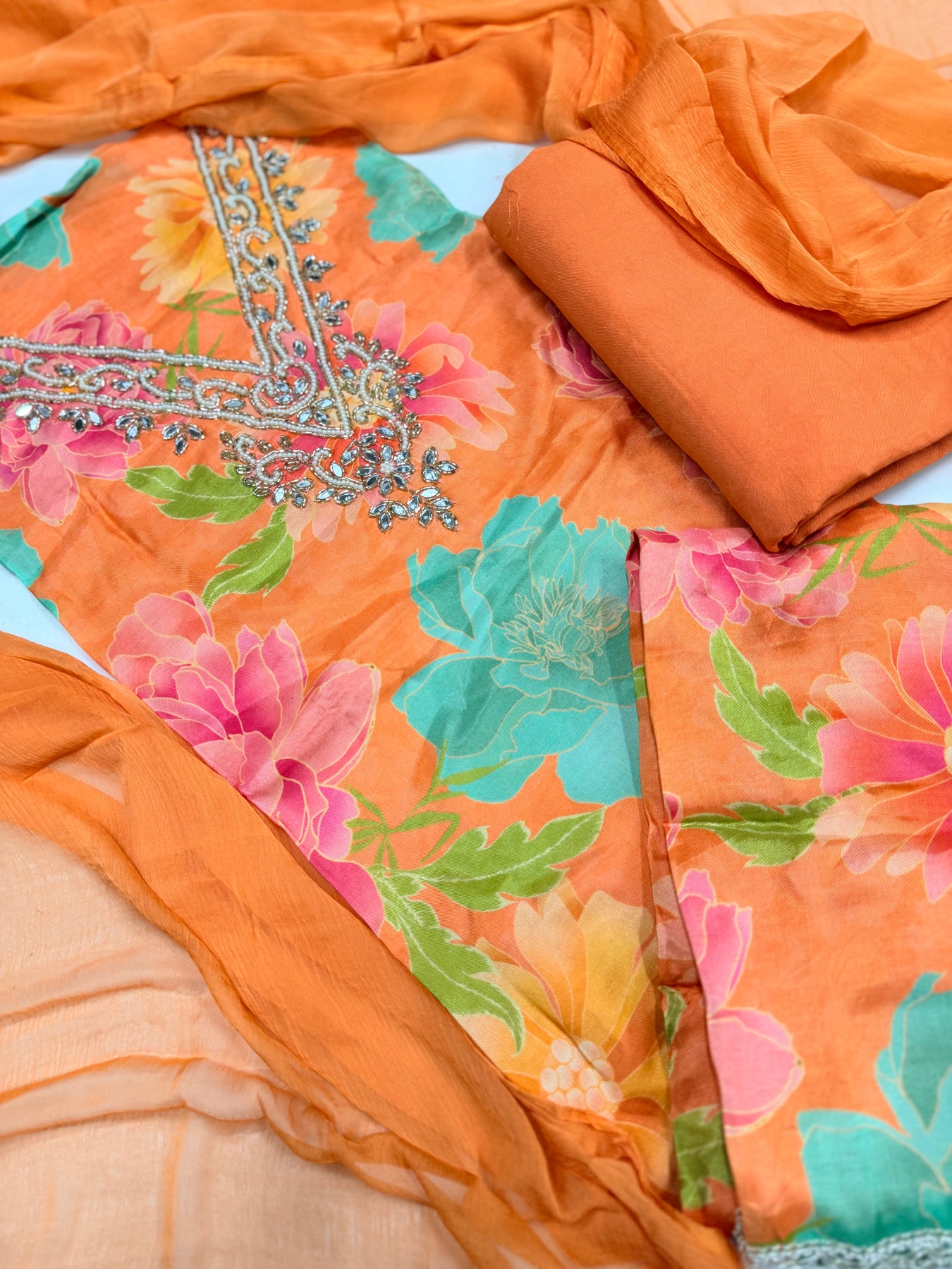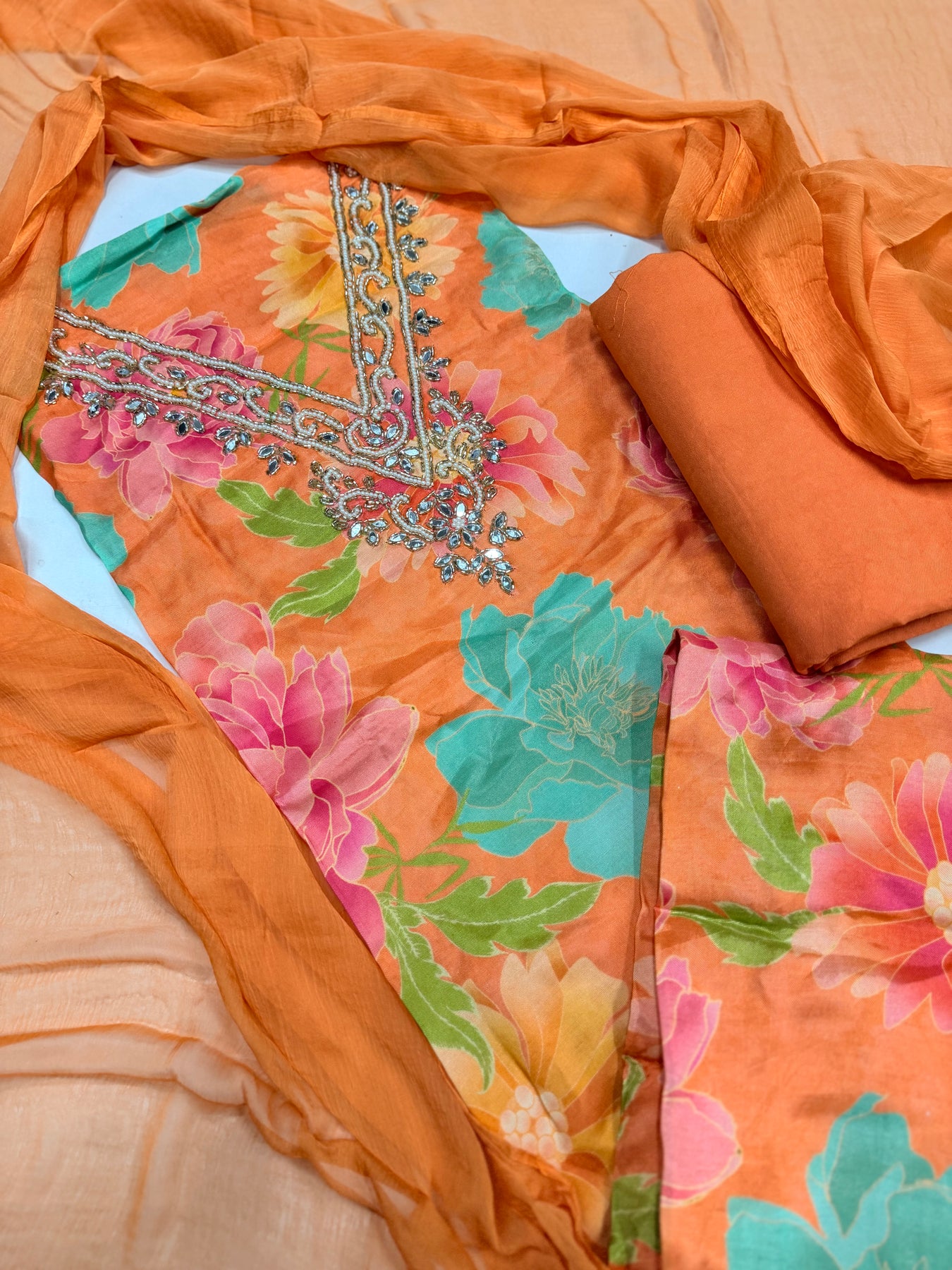 Crafted with luxurious maslin fabric, this stunning v neck mirror suit is the perfect addition to your party wear collection. The intricate mirror work adds a touch of glamour and elegance, making you stand out at any event. The perfect blend of comfort and style, this suit is a must-have for any fashion enthusiast.