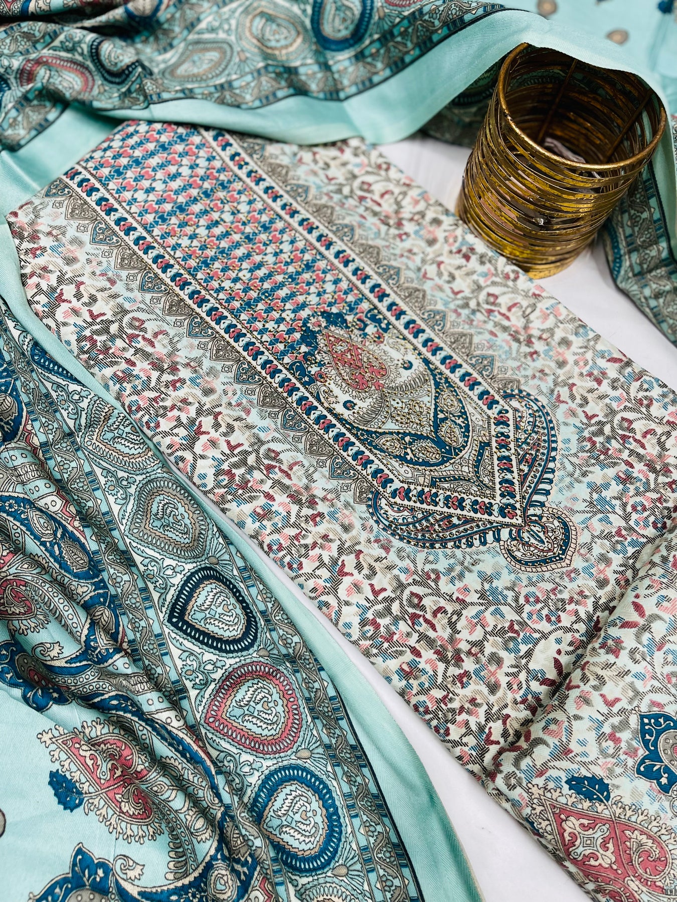 Our Premium PASHMINA kani Suit is made in India with the highest grade of spain  fabric. This luxurious fabric is a perfect blend of wool and silk, giving you an incredibly soft and comfortable fit. Our suit is soft to the touch, light in weight, and warm in temperature. Unparalleled luxury awaits you with this one-of-a-kind suit.