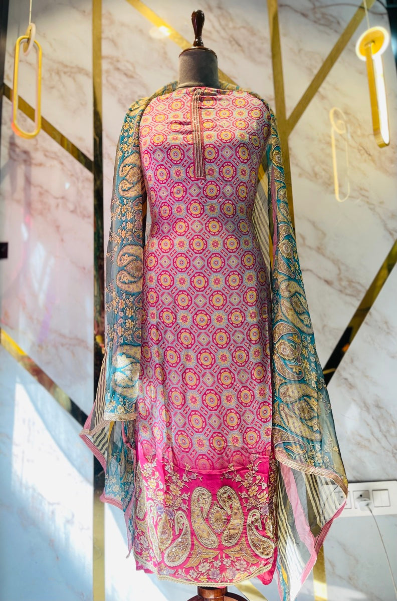 Experience the elegance of the premium Karigiri Dola Silk Suit, crafted with exquisite attention to detail. This suit features rich Dola silk fabric known for its smooth texture and subtle sheen, enhanced by intricate Karigiri embroidery that adds a refined artistic touch. Ideal for formal occasions, it offers both comfort and sophistication, making it a timeless addition to your wardrobe.