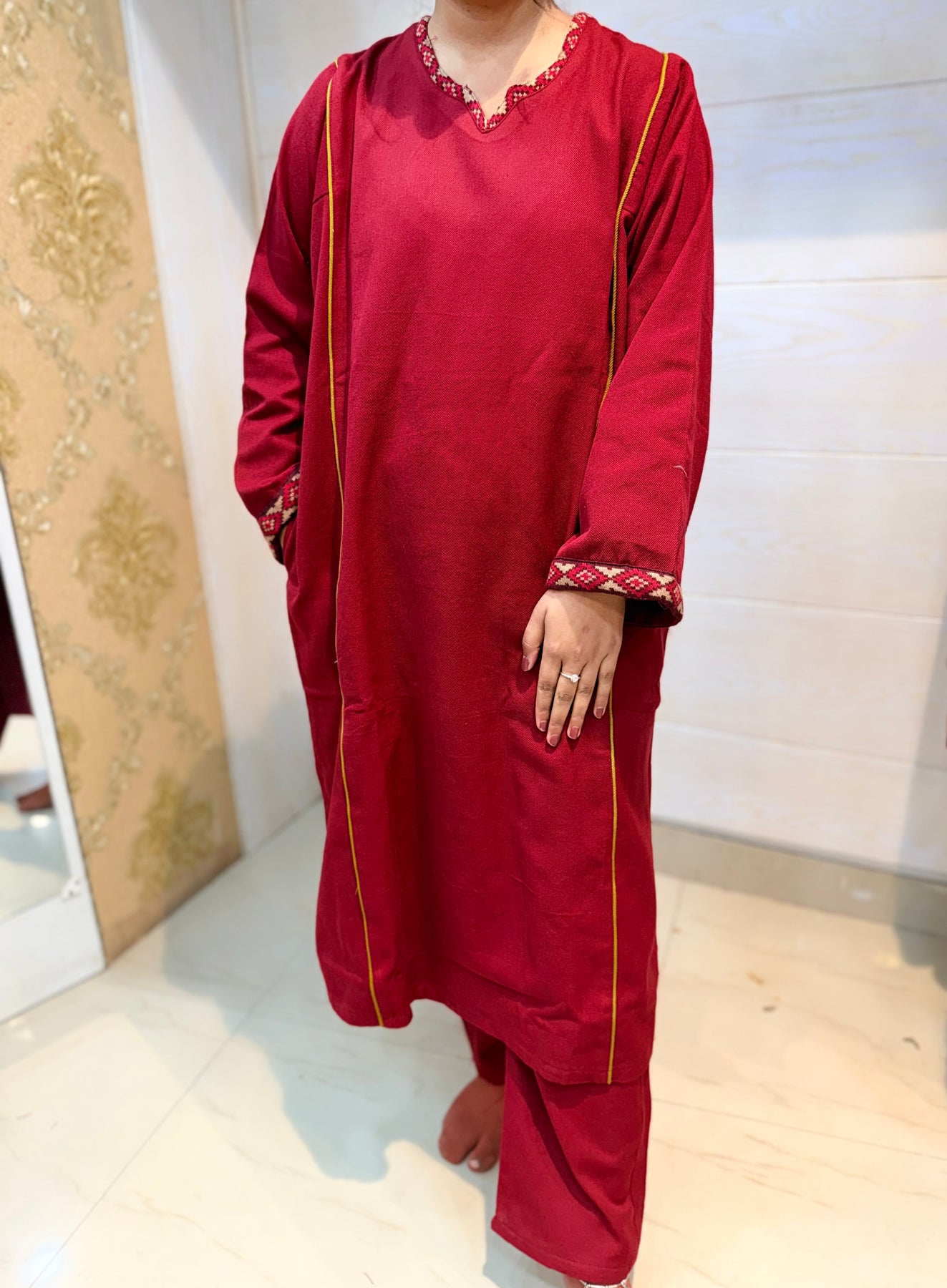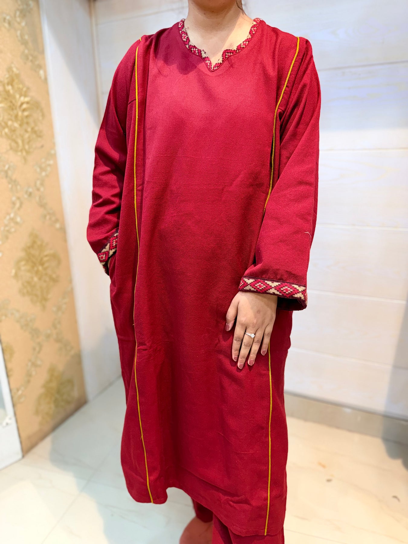 Embrace the timeless elegance of Himachal Pradesh with this premium winter choga, a traditional garment crafted for those who appreciate authentic craftsmanship. Designed to withstand harsh mountain winters, this choga features superior insulation and breathable fabric that keeps you warm without excess bulk. The expert tailoring honors traditional construction methods while delivering modern comfort and durability. Perfect for cultural celebrations, heritage enthusiasts, or anyone seeking a distinctive winter piece that combines functionality with cultural significance. A versatile layer that transitions seamlessly from casual wear to formal occasions.