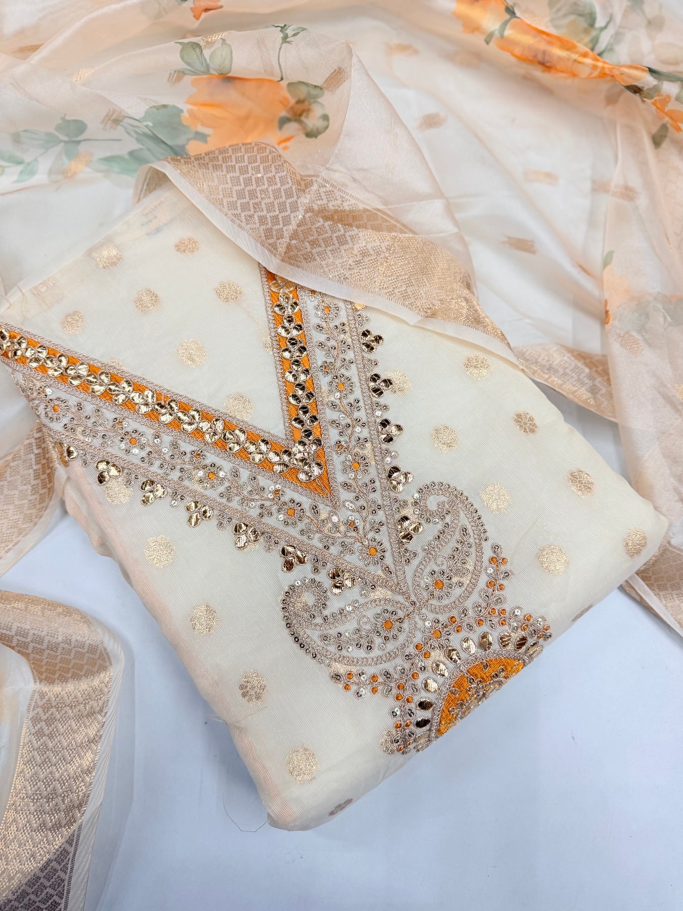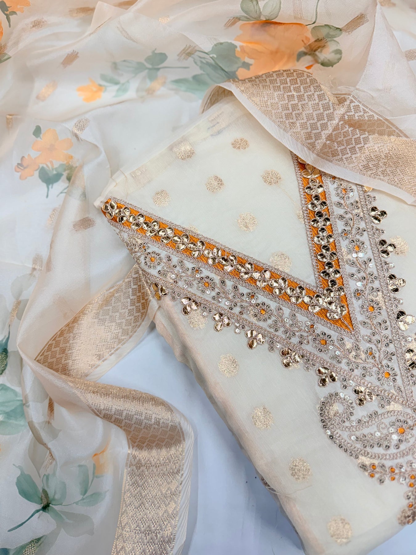 Elevate your festive wardrobe with this exquisite mirror work crape silk suit, meticulously crafted for the discerning celebrant. The lustrous crape silk fabric drapes with refined elegance, while intricate mirror embellishments catch light with every movement, creating a mesmerizing shimmer. Perfect for weddings, celebrations, and special occasions, this ensemble combines traditional craftsmanship with contemporary sophistication. The breathable silk ensures comfort throughout extended wear, while the detailed mirror work adds a touch of opulence that commands attention. An investment piece that transcends seasons and trends.