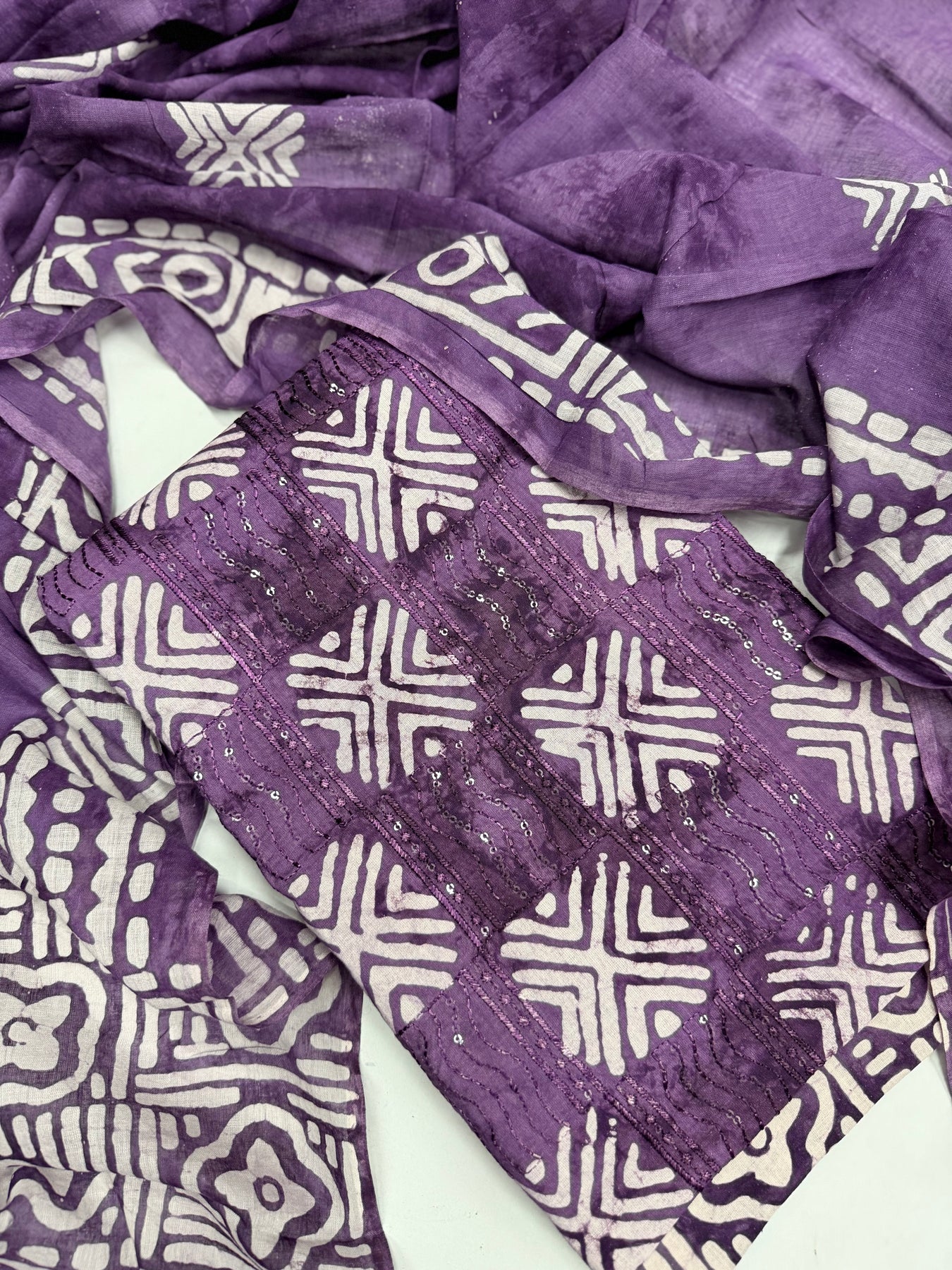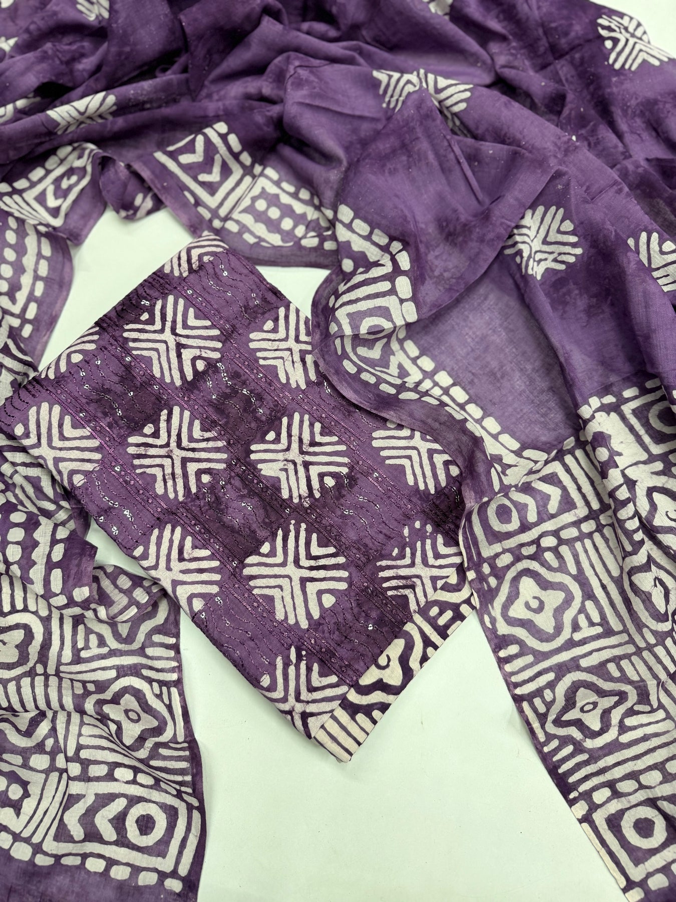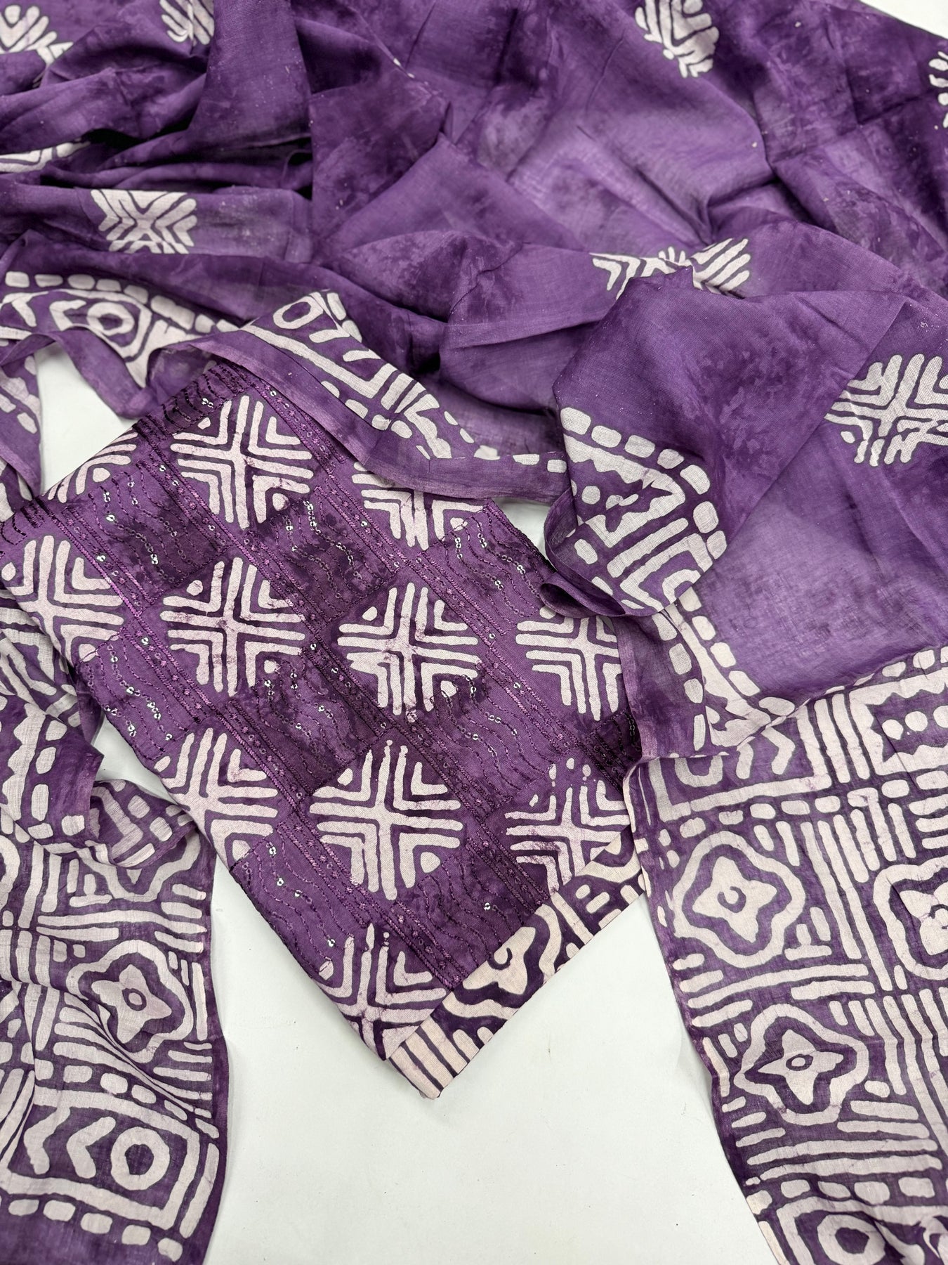 Crafted from high-quality cotton with a unique vatik print, our Premium cotton suits offer both luxury and style. The intricate print adds a touch of elegance to any outfit, perfect for any occasion. Elevate your wardrobe and make a statement with our premium suits.